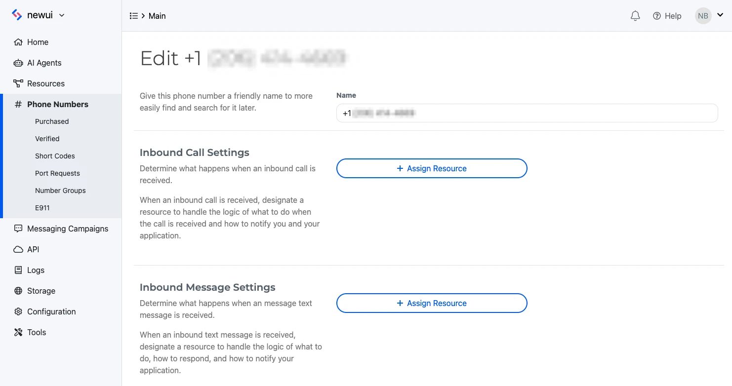 Navigate to the "Phone Numbers" tab on the left sidebar. From this tab, click on your newly purchased phone number, then on the "edit settings" option. In the settings page that appears, select "Assign Resource" for "Inbound Call Settings".